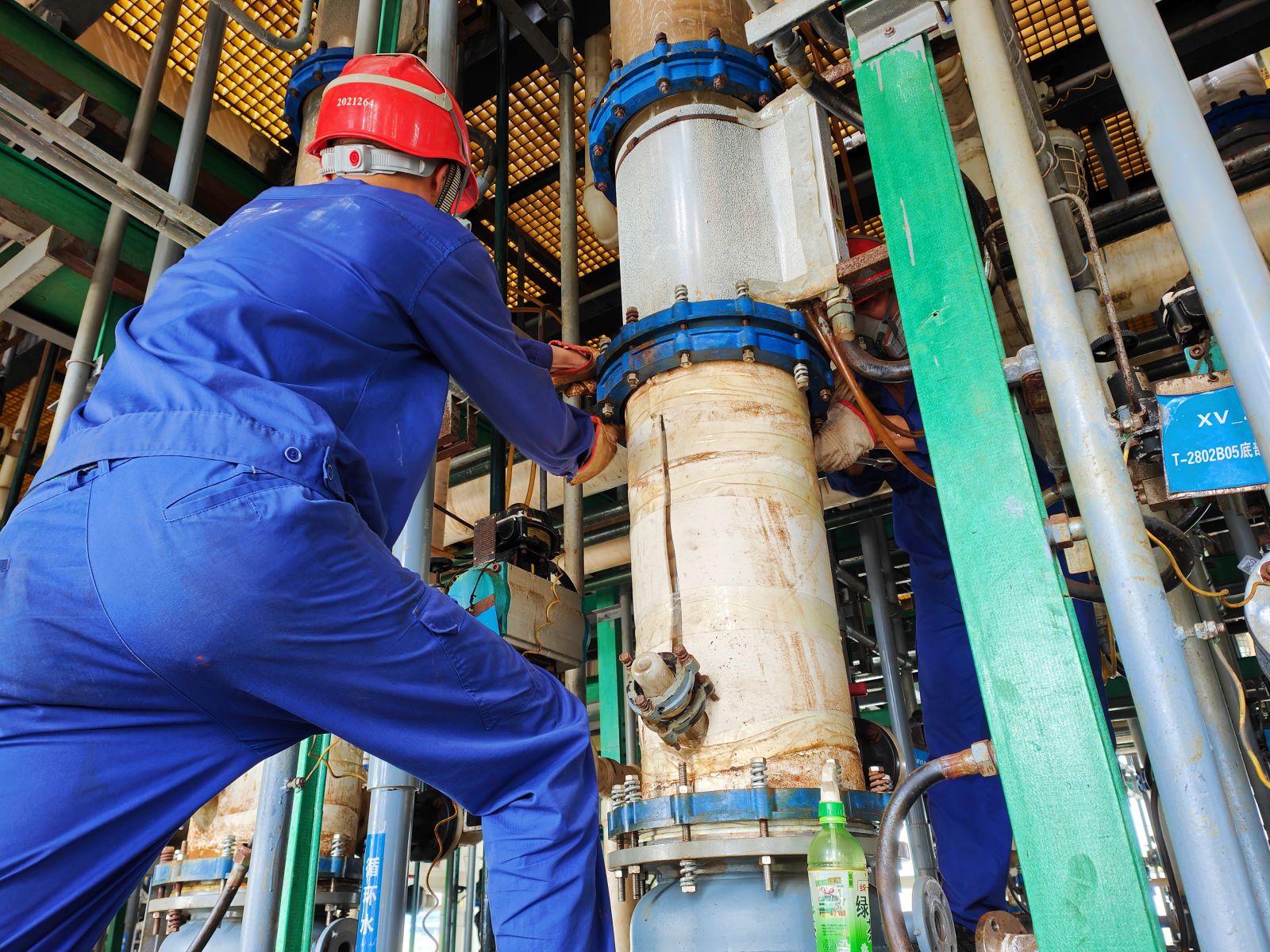 随着BTC产品包装工作的进行,检修时间愈发紧张。同时30台终氯塔衬搪瓷更换任务重、工作量大、检修难度高,需要将30台玻璃塔整体提升后拆卸掉第一节玻璃塔才能更换塔底搪瓷釜,再将30台玻璃塔安装还原,加之检修空间小、玻璃设备易碎的特性,聘请外来检修人员如果不熟悉设备易造成损坏,终氯塔拆卸安装的重任都压在BTC车间员工的肩上。在检修现场只能借助风扇带来丝丝清凉的情况下,员工身上被汗水打湿了又干、干了又湿,但为了保证顺利完成检修任务,他们没有一点抱怨与懈怠,认真细致地拧好每一颗螺栓,最终30台终氯塔衬搪瓷釜按照检修计划圆满完成更换。