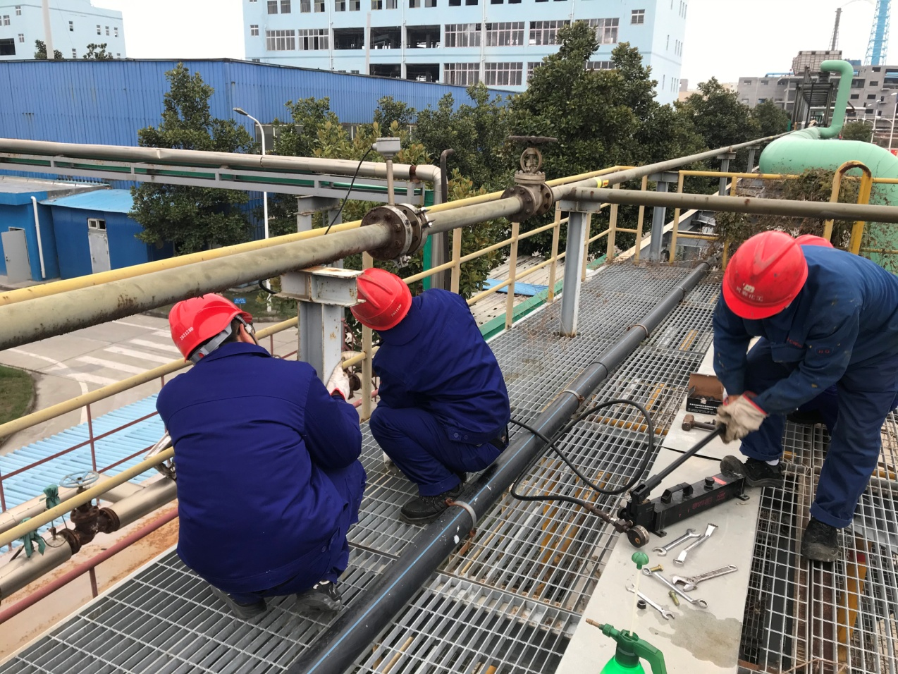 准备齐全后在生产总监刘年平、加氢车间主任李传勇的带领下,加氢车间堵漏抢险小组按计划前往漏点进行带压堵漏工作,首先在漏点法兰上安装好法兰夹,通过注剂枪往法兰夹里注射带压堵漏密封胶,完成密封后进行试漏,整个过程一气呵成。最终在不影响供气的情况下顺利完成了带压堵漏工作,保障了加氢生产线的供气安全。