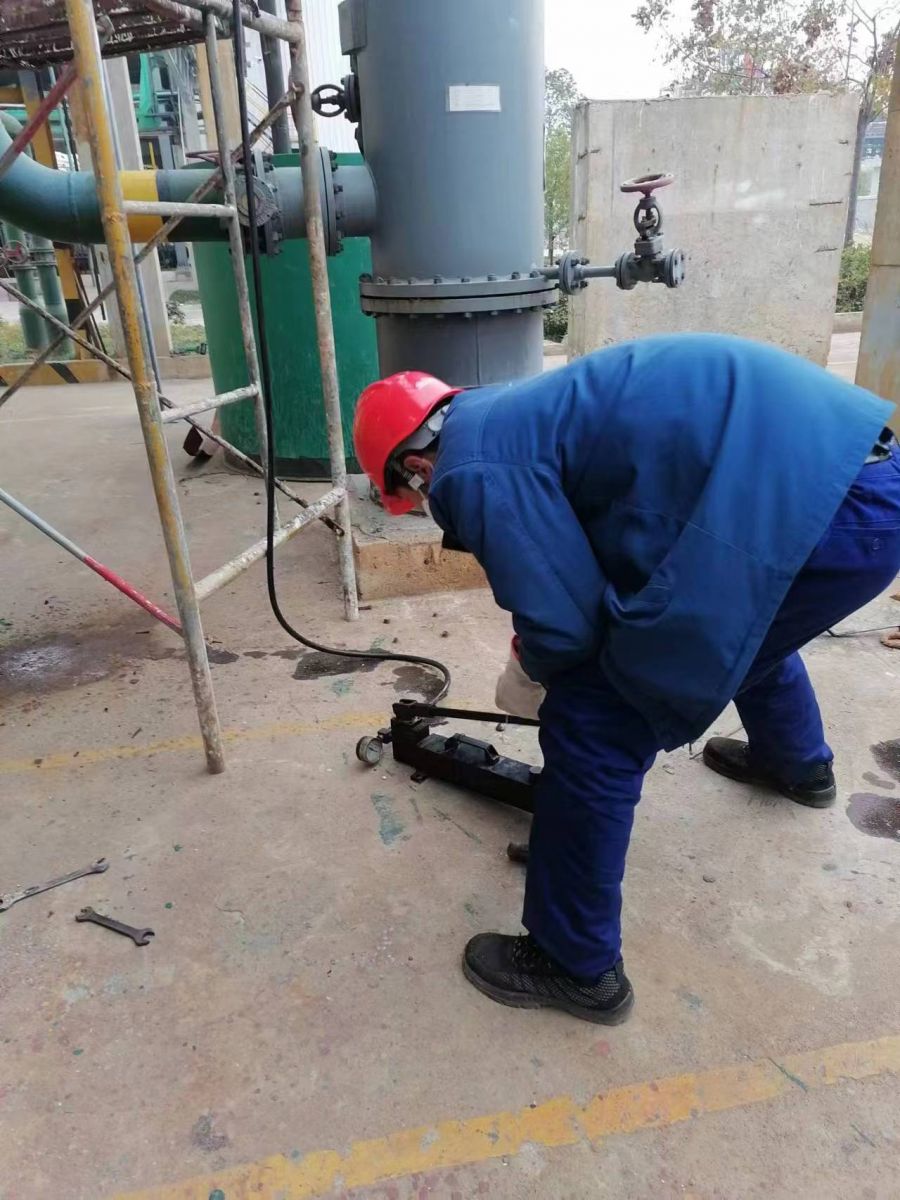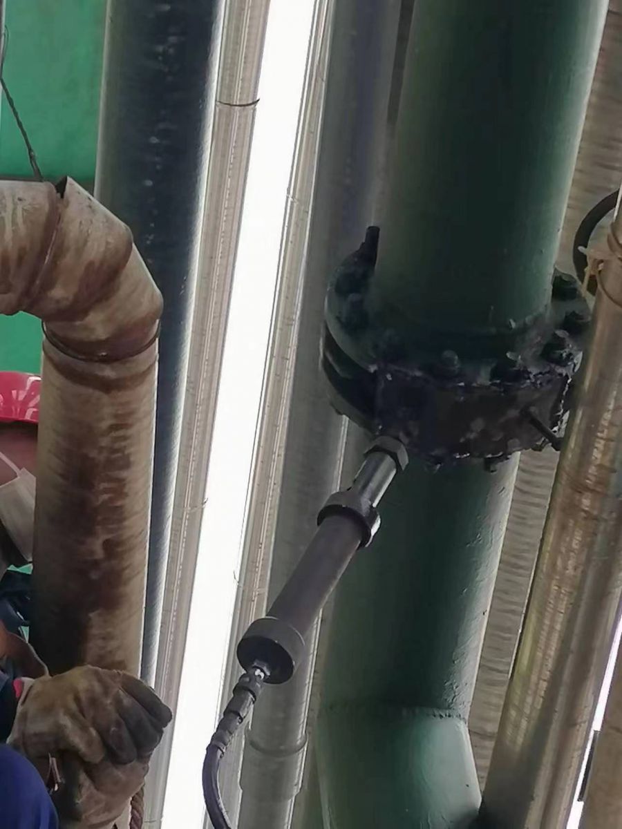 为了防止氯气外溢污染环境,他对渗漏点的法兰螺栓进行了加固处理,但效果不明显,正当他万分着急之时,车间领导何国亮和李敬平已赶赴现场,经他们进一步检查发现,对夹阀门垫片已变形,仅加固螺栓已不能解决渗漏。为了不影响正常生产,大家研讨后决定用带压密封料对其进行堵漏处理,经过近两小时的焊模安装、加料打压后,终于成功堵住了渗漏点。